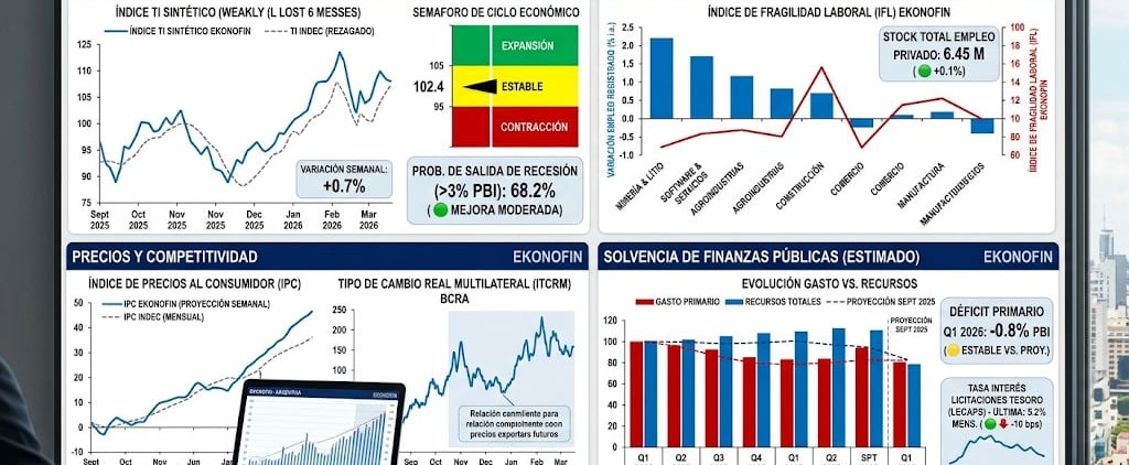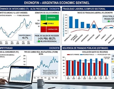 Inteligencia Macro. Monitoreamos en tiempo real solvencia fiscal (Devengado-Caja), términos de intercambio y fragilidad laboral. Nuestro modelo Probit integra inflación semanal, TCR y pasivos del BCRA para anticipar cambios de tendencia y probabilidades de crecimiento, superando el rezago de la estadística oficial.